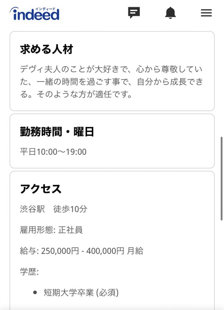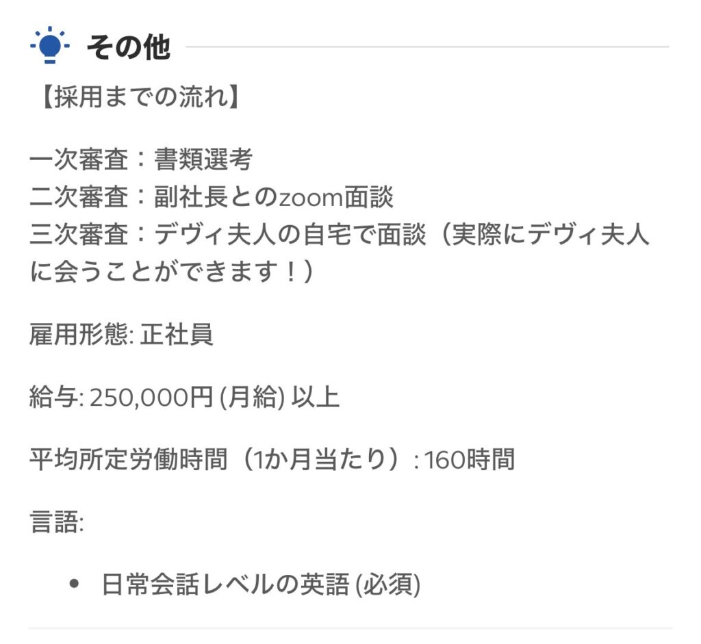 月給25万円、またデヴィ夫人の直面接があると話題になっている。