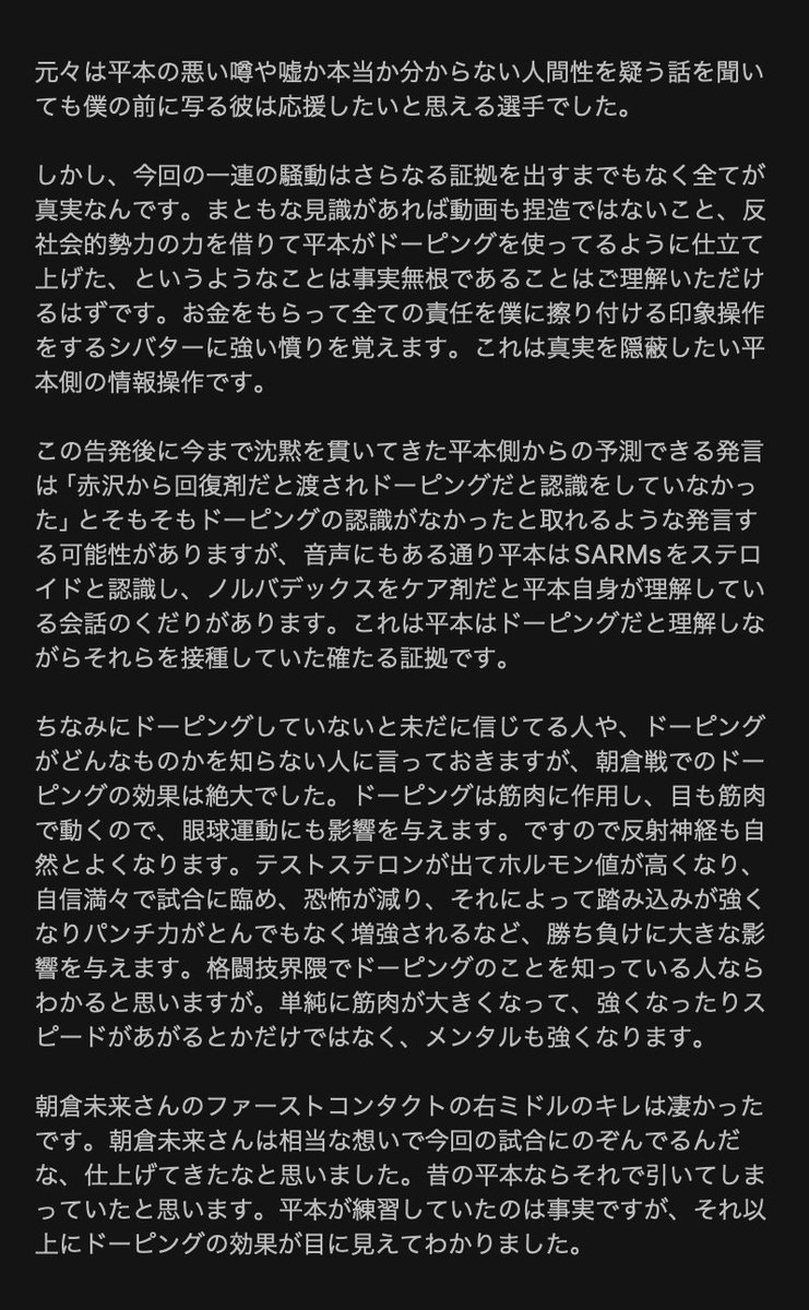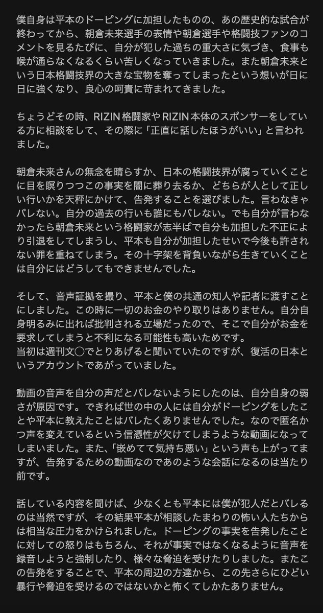 それによると、真偽不明の音声動画で平本蓮選手と話していたのは自分であり、本人から相談を受けてドーピングの方法を教えたと告白した。