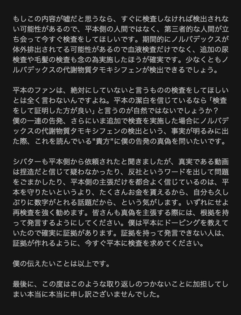 終盤では、今すぐ第三者によるドーピング検査実施の必要性を訴えつつ「この度はこのような取り返しのつかないことに加担してしまい本当に本当に申し訳ございませんでした」と謝罪した。