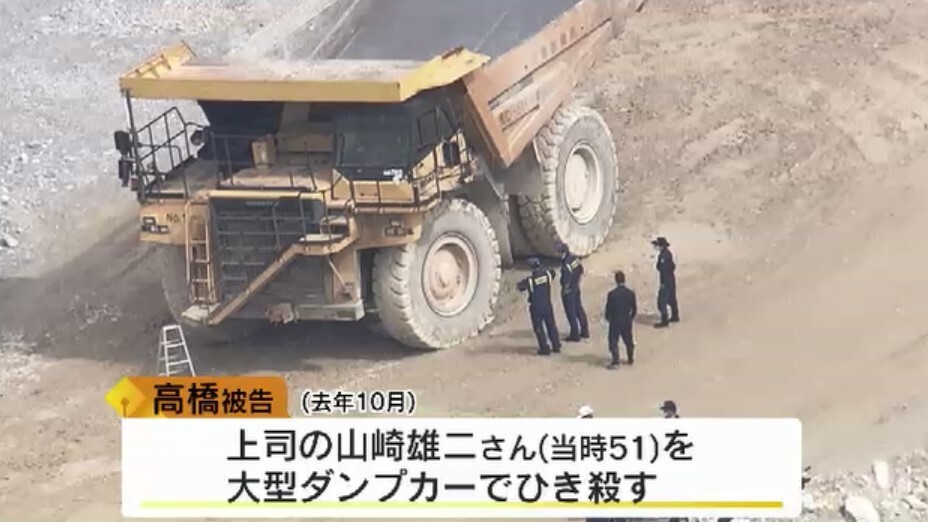 福岡県築上町の無職、高橋博行被告(62)は去年10月4日午後2時半ごろ、北九州市小倉南区新道寺の採石場で、70トンの大型ダンプカーを運転し、上司の山崎雄二さん(当時51)をひき殺したほか、別の同僚男性2人もひき殺そうとしたとして、殺人と殺人未遂の罪に問われていました。