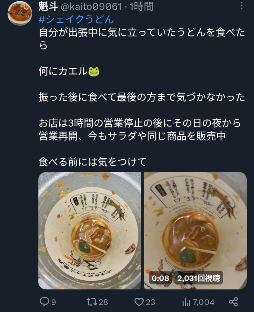 23日、「ピリ辛担々サラダうどん」にカエルが混入していたと事実を認め、「多大なるご心配とご迷惑をお掛けしたことを深くお詫び申し上げます」と公式サイトで謝罪した。 pic.twitter.com/cMfuy8BXEs