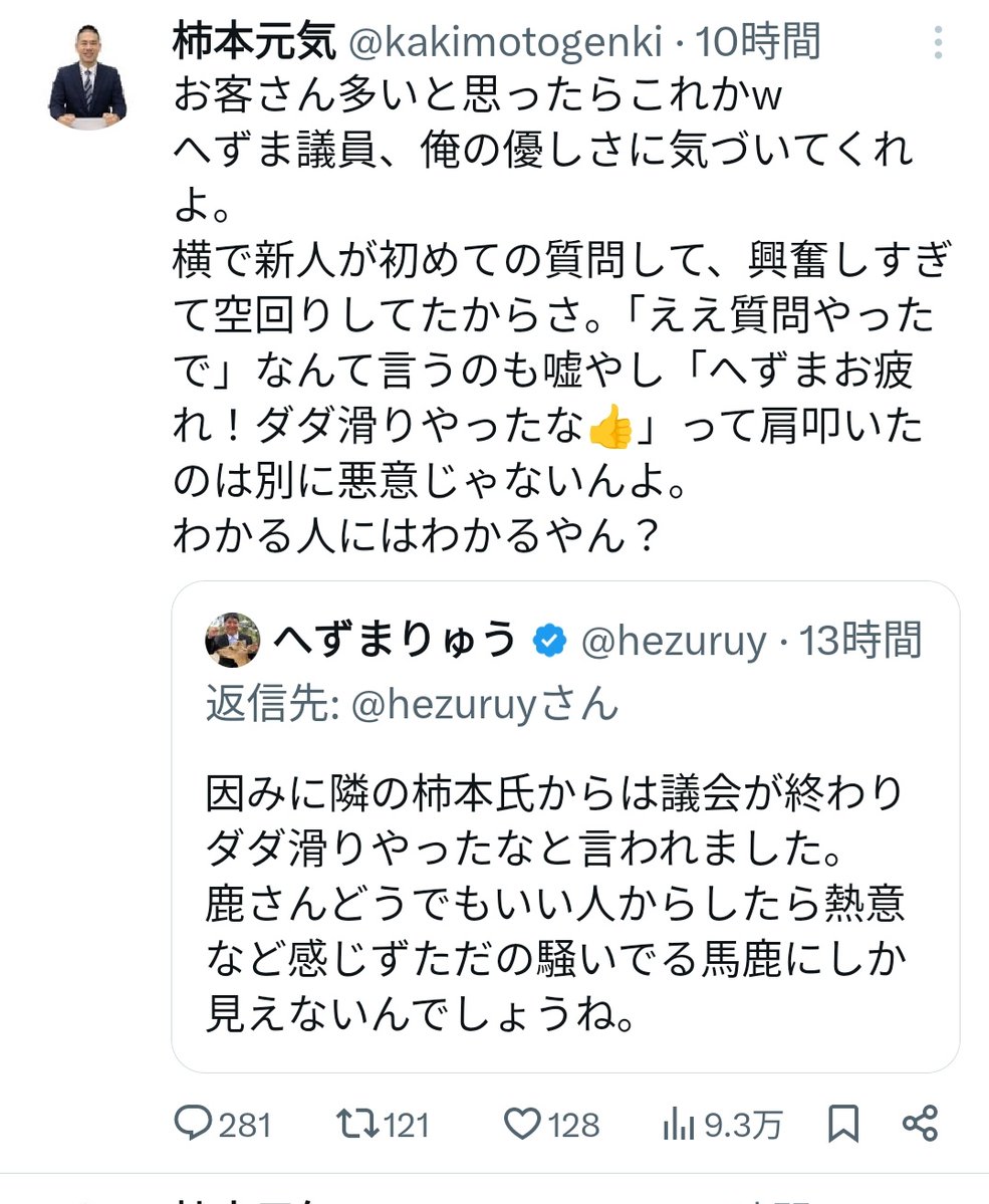 別にへずまを応援はしていないが、この柿本って議員は絶望的にSNS向いてないな。