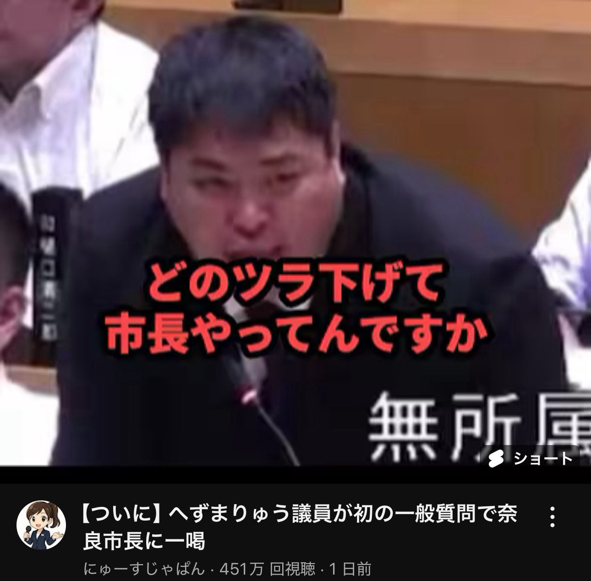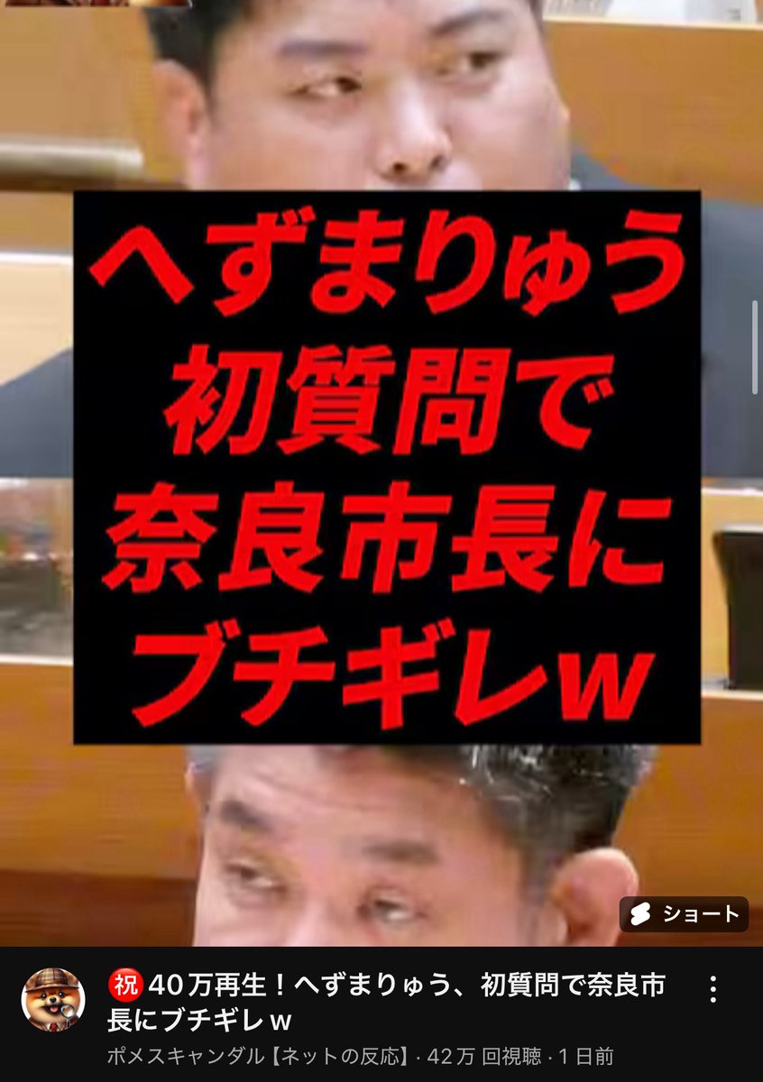 へずまりゅうが議会の一般質問で市長に怒鳴ってるやつ、YouTubeの政治系切り抜きでは既に「伝説」として持ち上げられ、いくつかのショートでは数百万回再生されてる地獄。