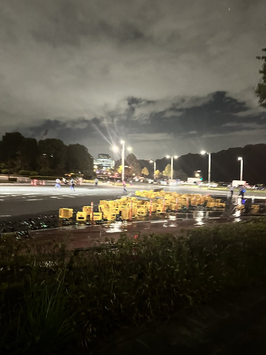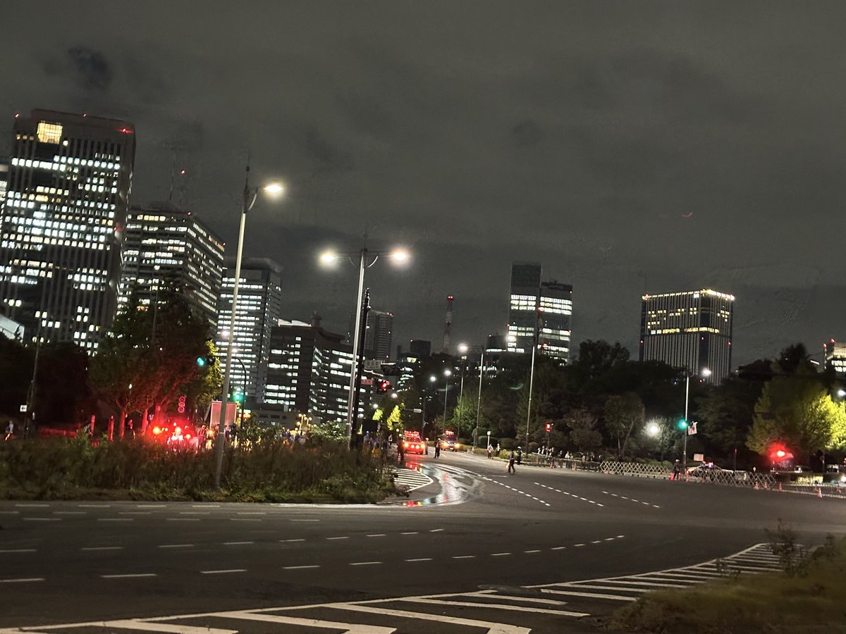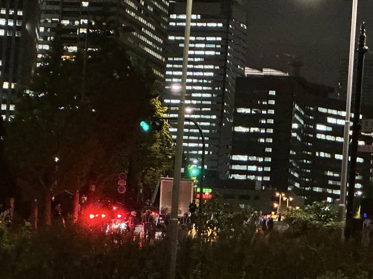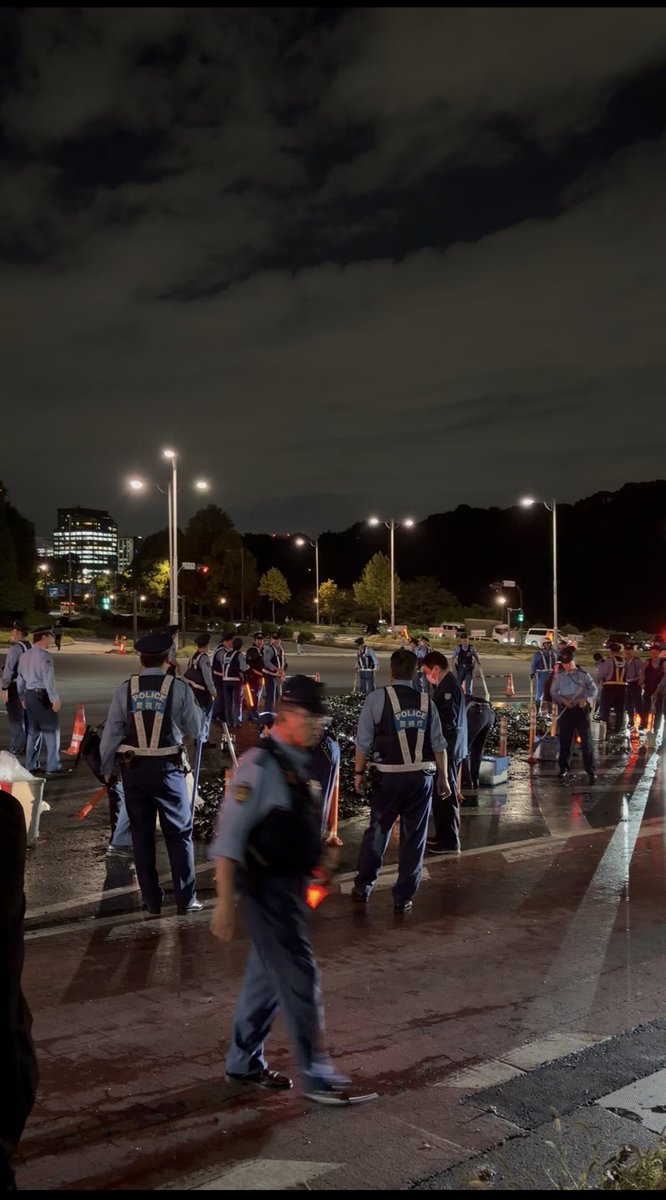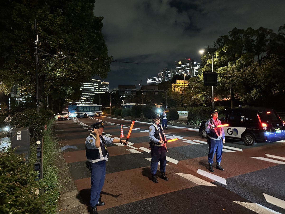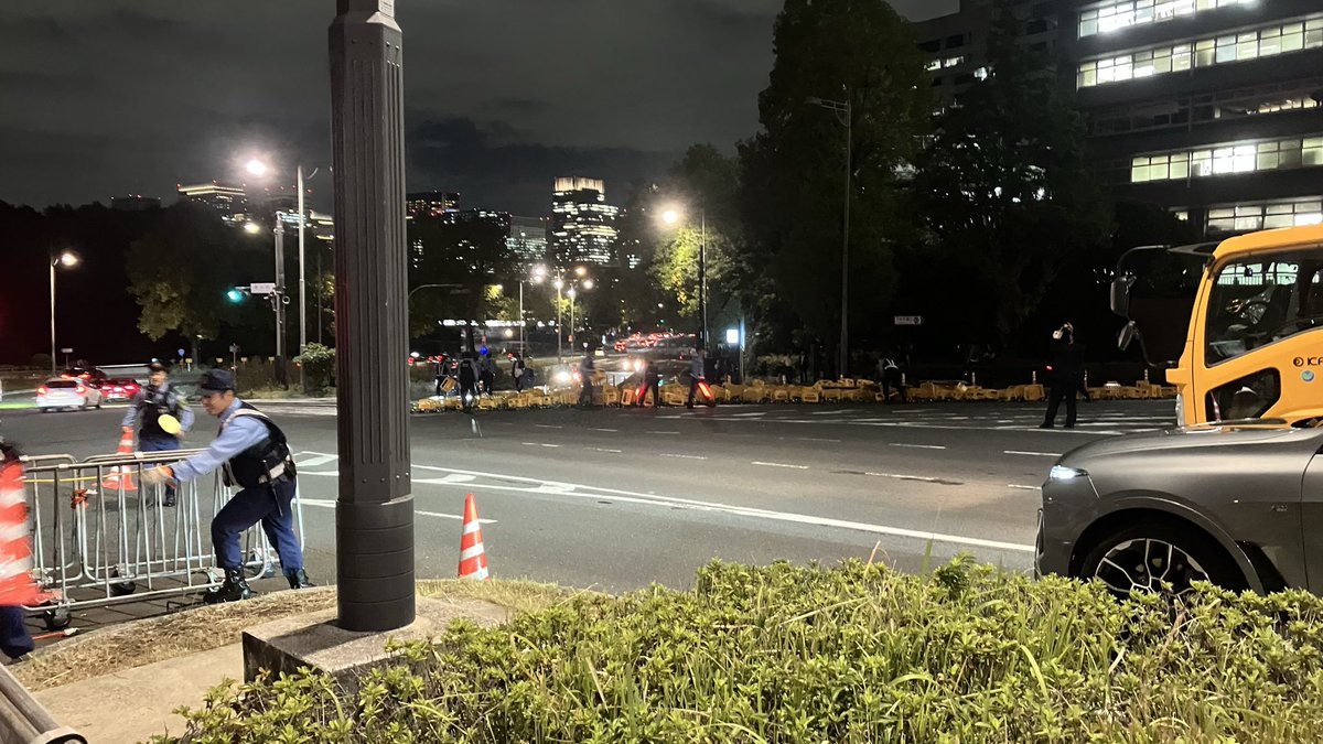 当時、トランプ米大統領は皇居を訪問中だった。現場周辺には割れた瓶が広範囲に散乱し、多くの警察官が対応に当たっていた。