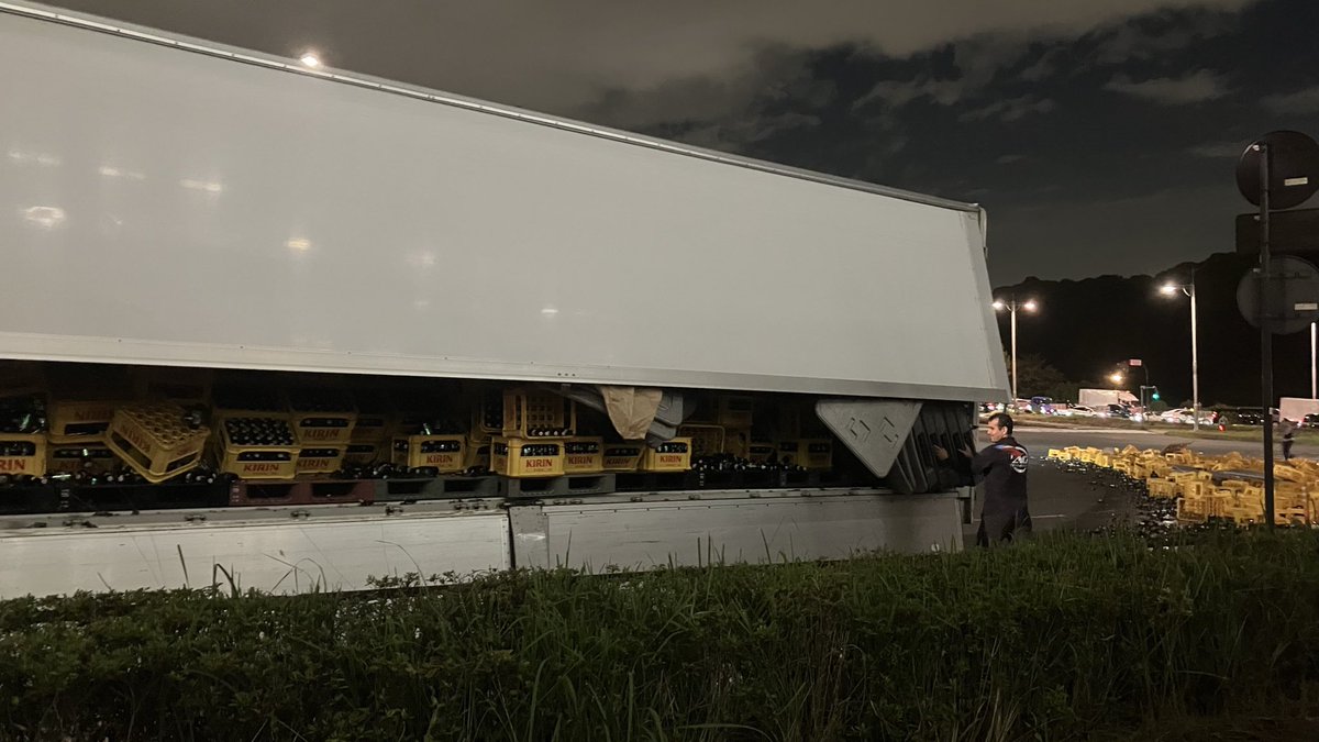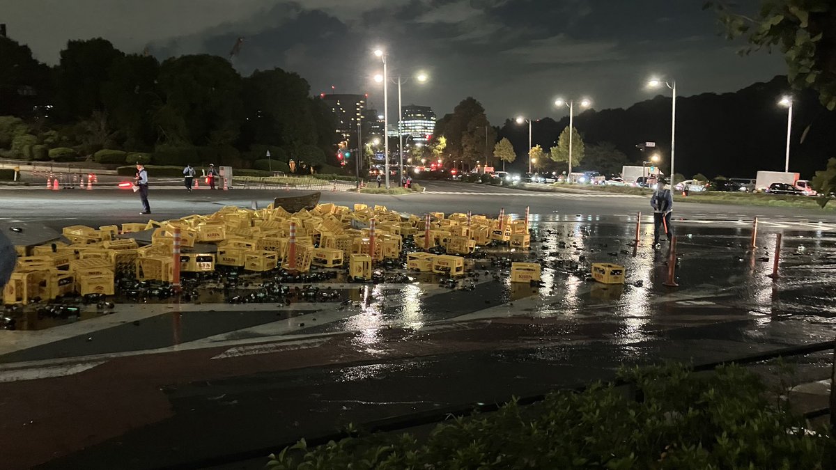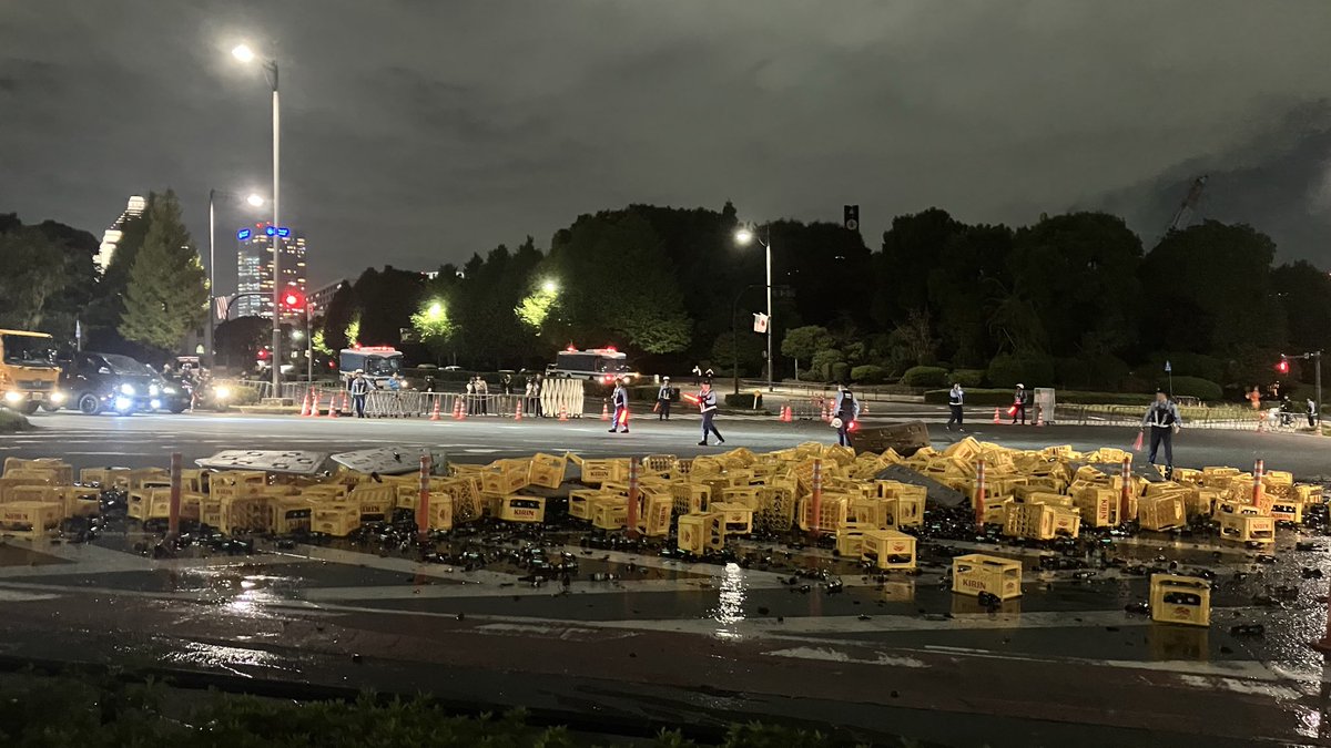 麴町署によると、大型トラックは三宅坂方面から交差点へ進行。右折時に何らかの理由で左側の扉が開き、積んでいた瓶ビール数十ケースが道路上に落下したという。この事故で、けが人はなかった。署が詳しい状況を調べている。