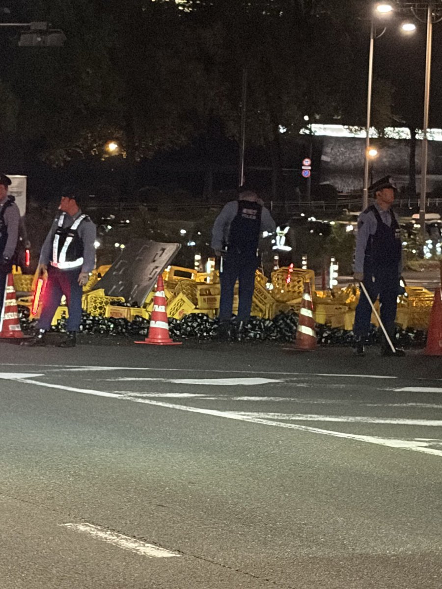 27日午後6時55分ごろ、東京都千代田区の国会議事堂近くの交差点で、大型トラックが荷崩れを起こし、積み荷の瓶ビールが散乱する事故があった。周辺の道路は米国のトランプ大統領来日に合わせて交通規制が実施されていたが、警視庁麴町署によると、警備に影響はなかったという。