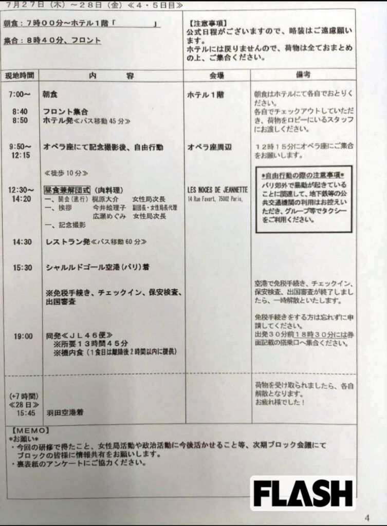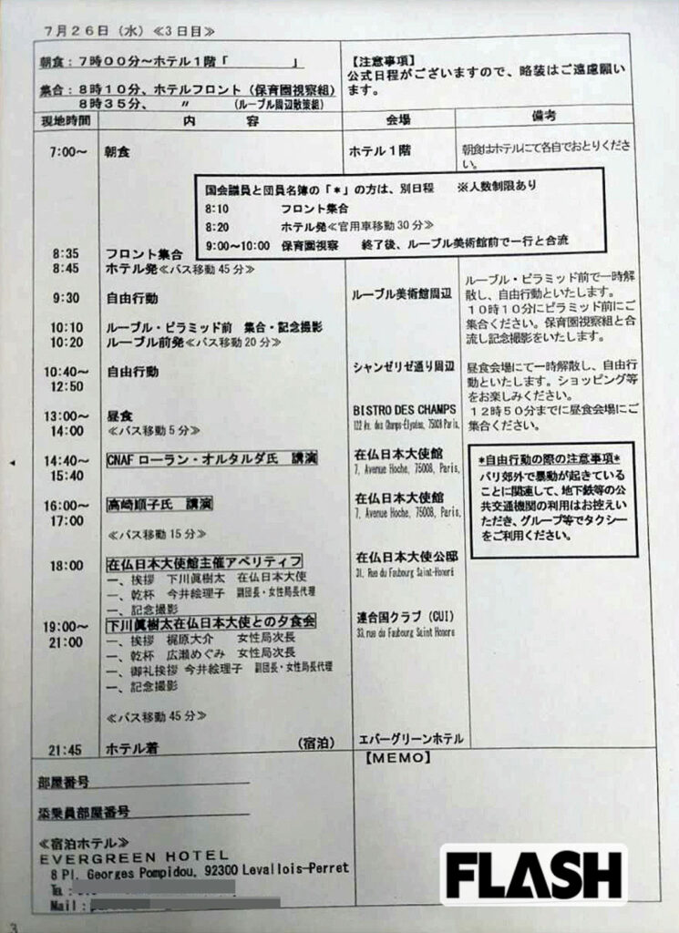 3日めは、さらに観光色が強い。国会議員らには午前中に1時間の保育園視察があるものの、他の参加者は14時40分まで研修はない。国会議員らも早々に合流し、シャンゼリゼ通りでの自由行動が2時間以上。旅程表には「ショッピング等をお楽しみください」とわざわざ書かれ、はしゃぎっぷりが伝わってくる。