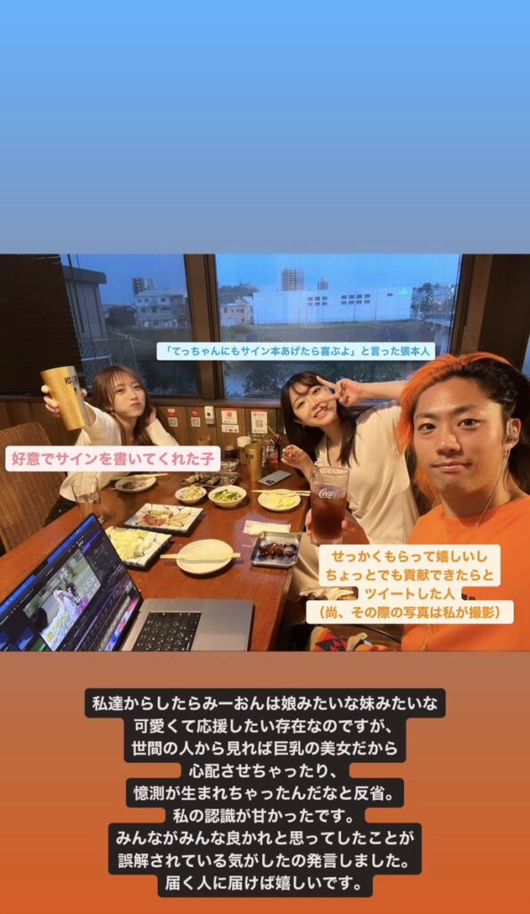 これらの声に対し、峯岸は3人の写真を公開し「好意でサインを書いてくれた子」と向井地について説明し、「てっちゃ