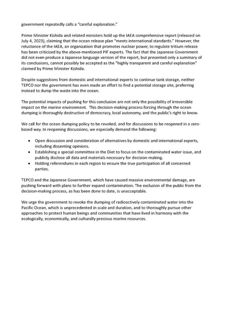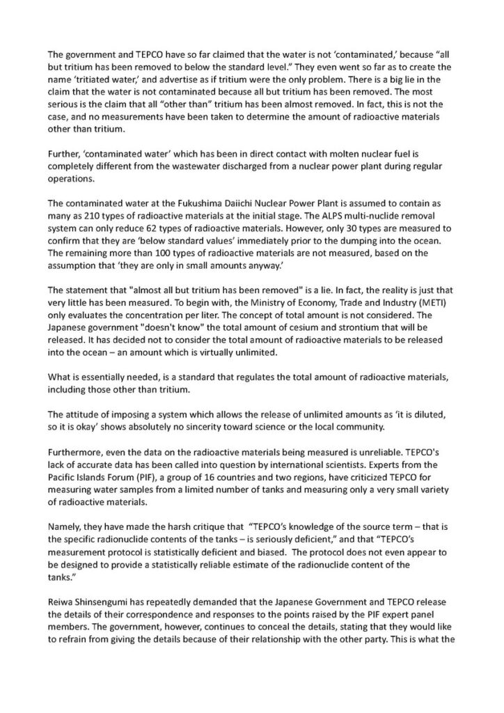 れいわ新選組は、2023年8月24日の岸田政権による放射能汚染水放出の撤回を求める声明を出しました。